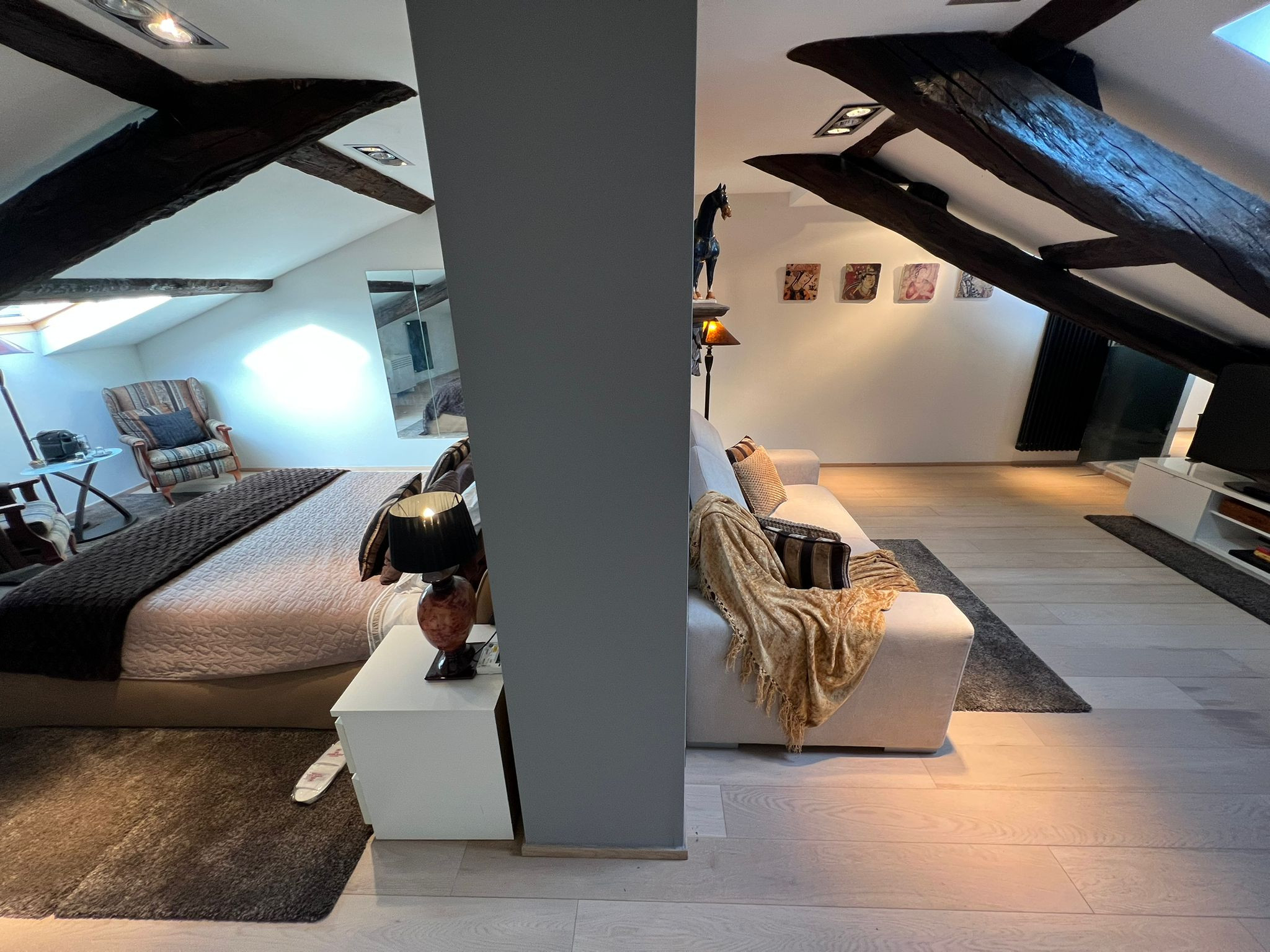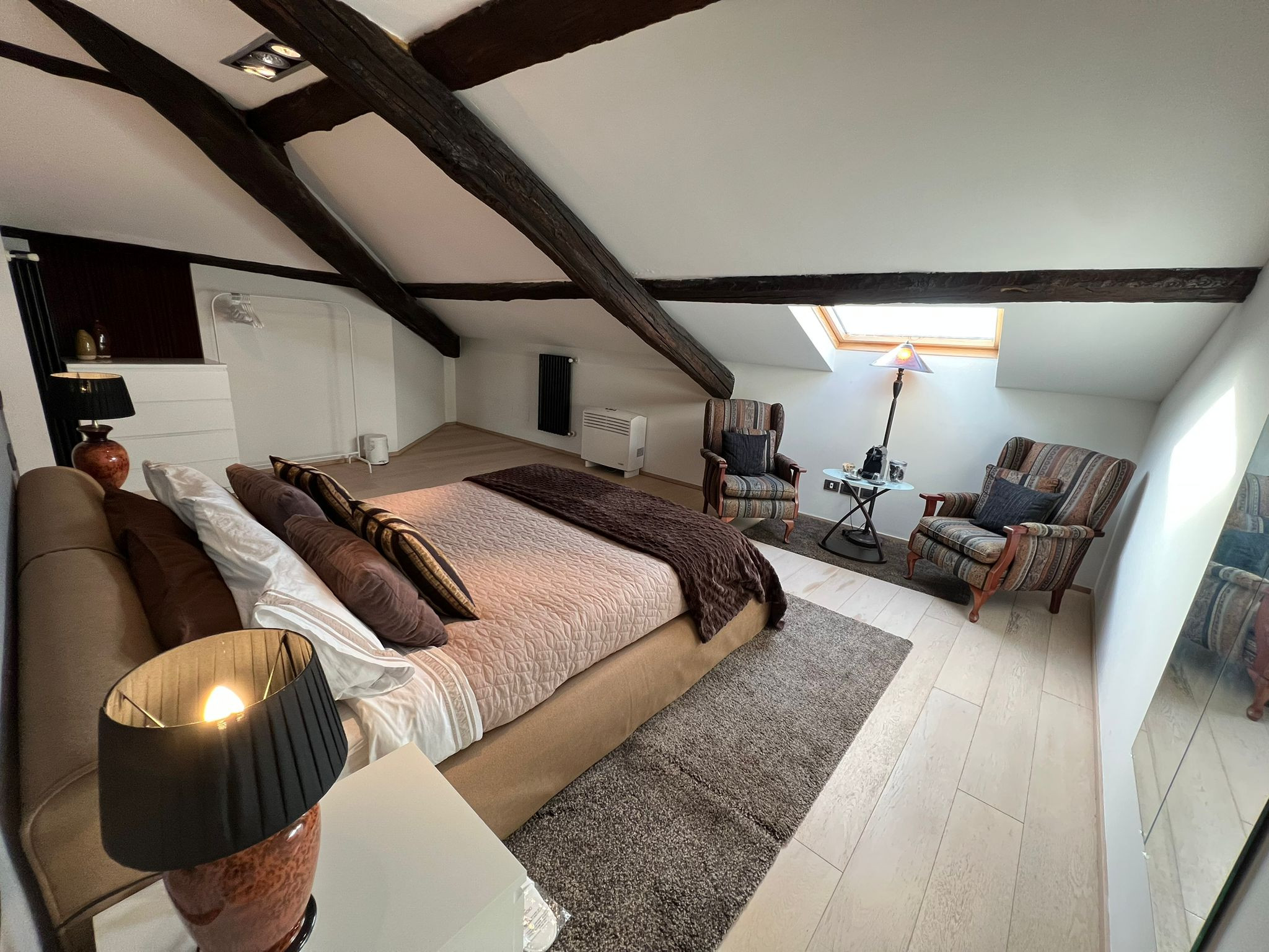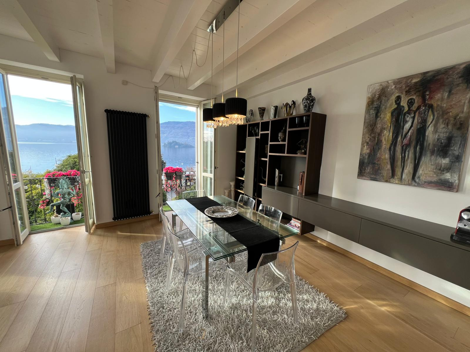 Au deuxième étage d'une maison typique du bord du lac à Verbania Pallanza se trouve l'appartement Charles, un appartement très élégant et confortable qui bénéficie d'une vue magnifique sur le lac et les îles Borromées. Depuis l'entrée, on accède au salon très lumineux, divisé en deux zones. La première avec une télévision et un coin salon avec un canapé convertible en lit pour deux personnes, puis on entre dans la pièce principale qui donne sur le lac, où se trouvent un autre coin salon, une grande table à manger et une cuisine moderne équipée de tous les appareils électroménagers. À côté du salon, il y a un petit balcon avec une table et deux chaises pour prendre un café en admirant la vue sur le lac et les îles. Toujours à cet étage, vous trouverez une première salle de bains avec baignoire/douche hydromassante, une deuxième salle de bains avec une grande douche et un coin buanderie, ainsi qu'une grande chambre double. En montant les escaliers, vous accédez au grenier climatisé où se trouvent une petite salle de bains, une très grande suite avec un lit double et un coin salon avec une armoire, une télévision et un canapé qui peut également être déplié pour devenir un autre lit double. L'appartement est très pratique, situé dans le centre de Pallanza, avec un pass pour garer la voiture dans les parkings à proximité. L'embarcadère se trouve à une minute à pied, tout comme le bord du lac avec ses bars et restaurants et la piste cyclable qui mène à Intra. Un emplacement luxueux et élégant pour des vacances haut de gamme au cœur de la ville.