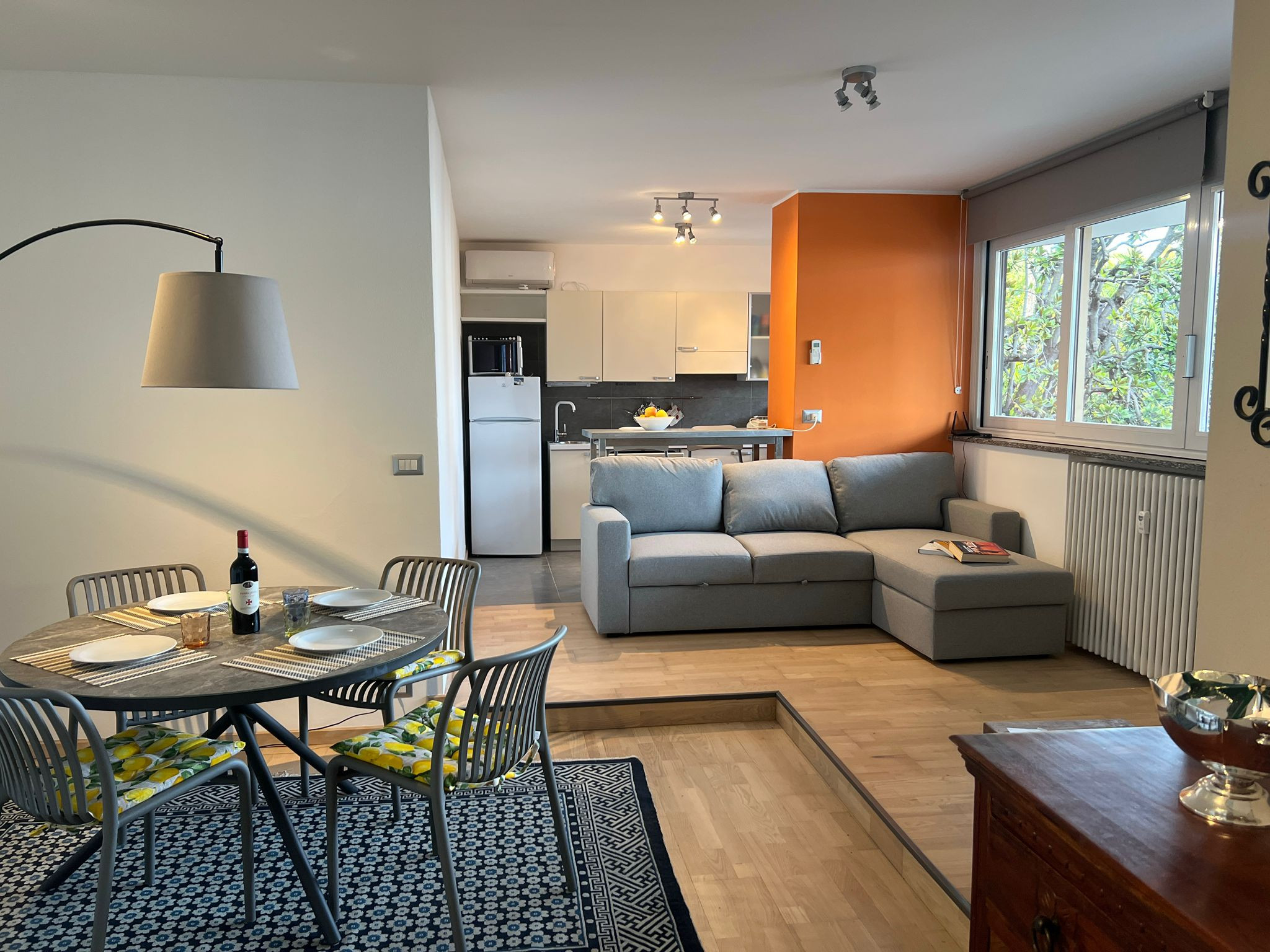 The large bright living room is equipped with a dining table, the modern kitchen is equipped with all appliances. The living room, with double sofa bed and satellite TV, overlooks a terrace equipped with a table, chairs and deck chairs from where you can enjoy a wonderful view of the lake and the park of the villa. The two bedrooms both have a large wardrobe and double bed, the bathrooms have a shower and the largest also has a washing machine. Parking spaces are available under the house for guests.